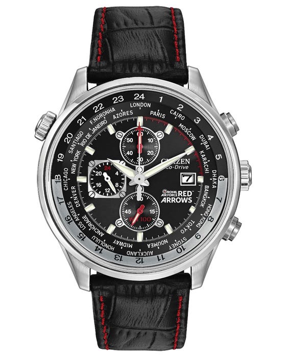 CA0080-03E Take to the skies with this chronograph from Citizen’s RAF Red Arrows Collection. Styled in stainless steel with a black dial featuring red and white accents, a black leather strap with red stitching, 1/5 second chronograph and 12/24 hour time. The official Red Arrows insignia appears on the watch...