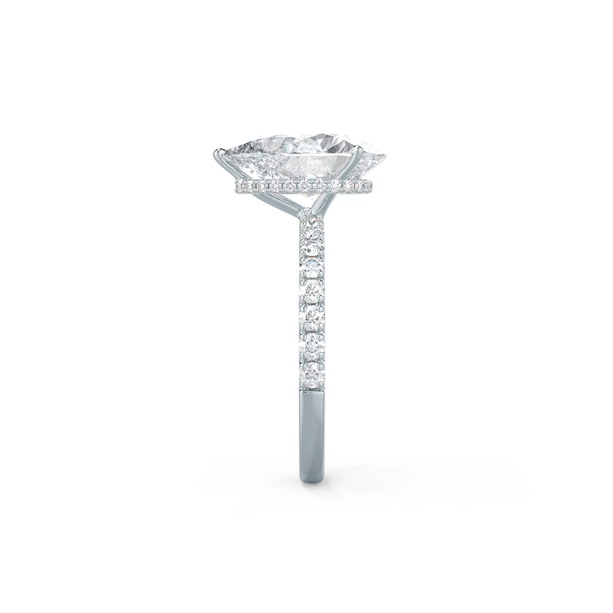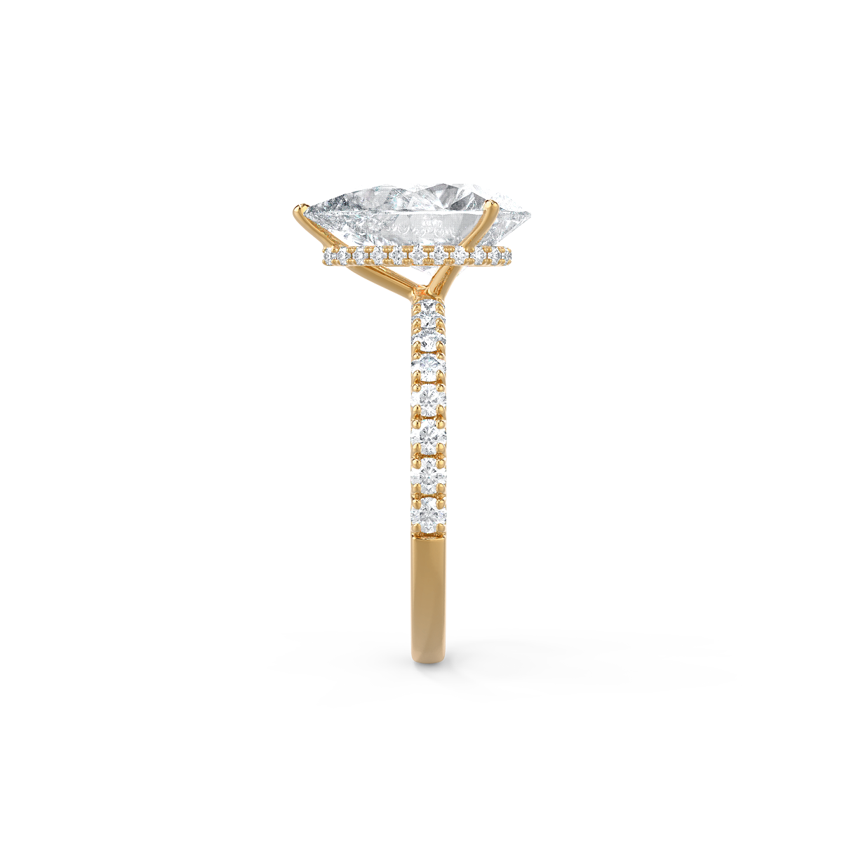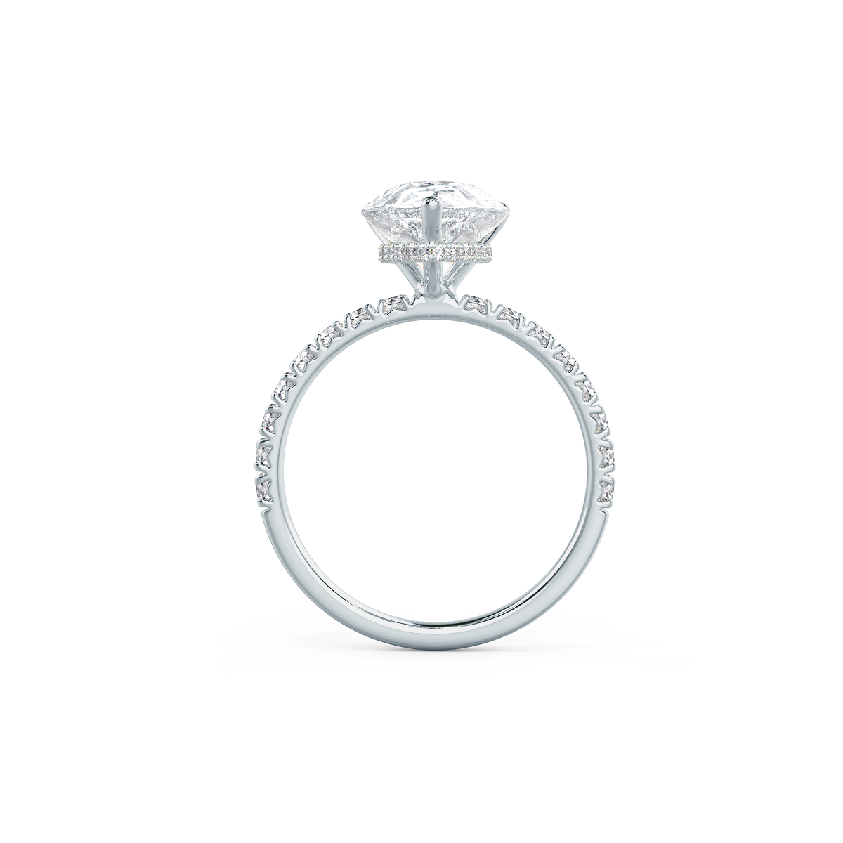 This signature pear hidden halo ring will take your breath away! The discrete halo featured underneath the main diamond enhances the true beauty of this diamond ring. Every time you take a closer look, you will reveal another subtle beauty. The fishtail pavé-set band creates a classy and sophisticated feel. The pear shape diamond is also referred to as the '' teardrop diamond'' which accentuates the finger making it appear longer and slender. She will definitely feel special wearing this ring!