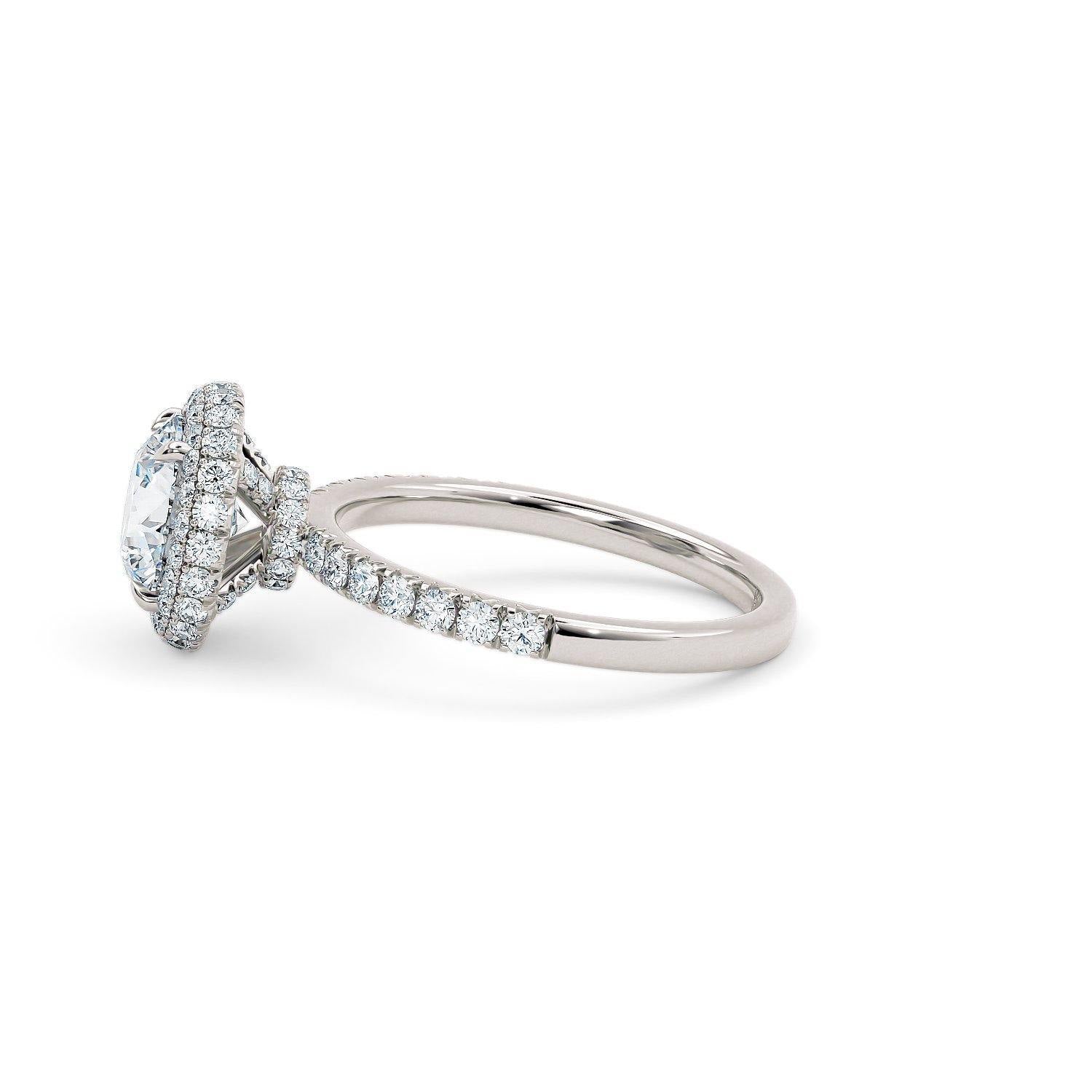 The round triple halo is crafted to enhance the look of the main diamond, using a perfectly balanced pave set halo and diamond band. The main halo features an additional halo around the bezel to ensure a more striking appearance. If you take a closer look, slightly on top of the pave band you'll notice a third halo. Each small melee diamond is perfectly positioned to the next, allowing a continuous and consistent sparkle across this whole masterpiece. This ring will definitely capture her attention.