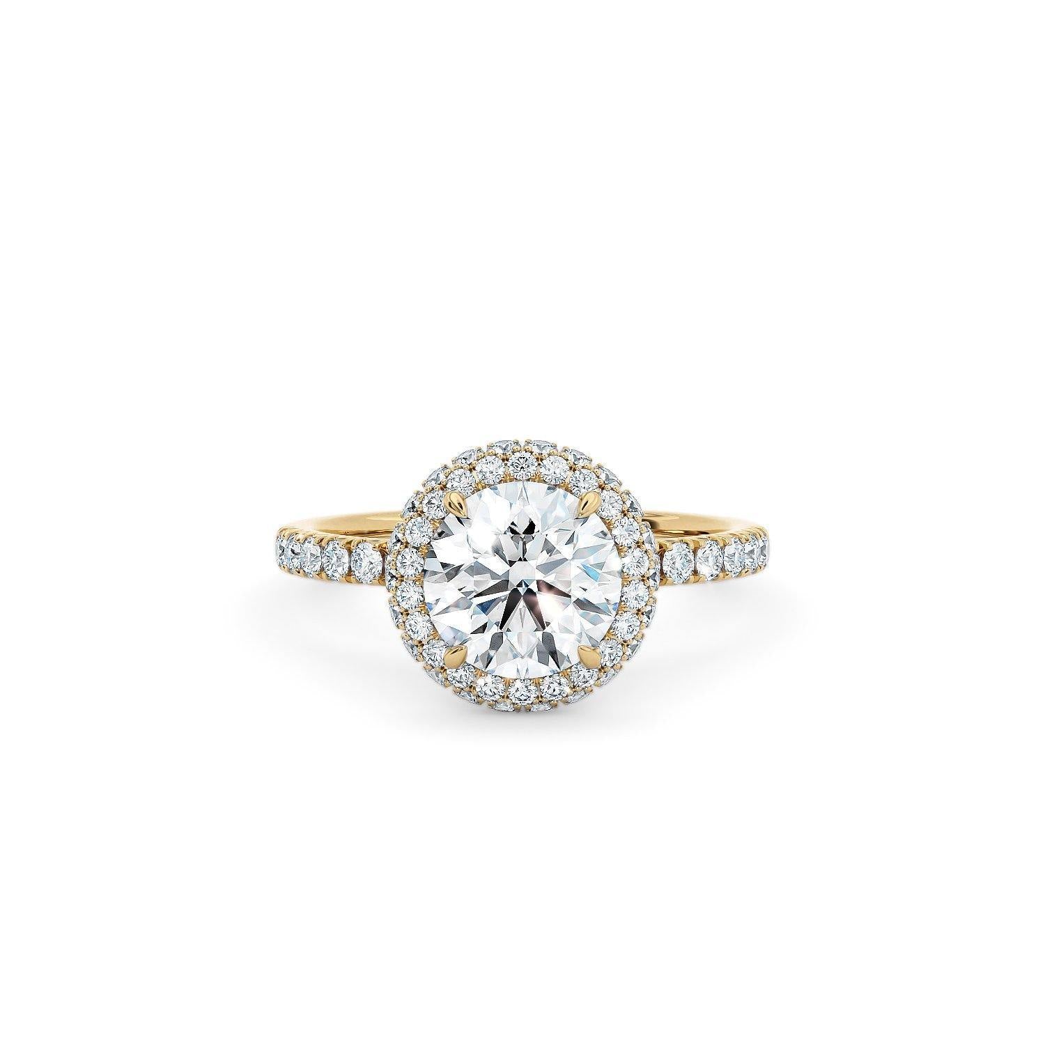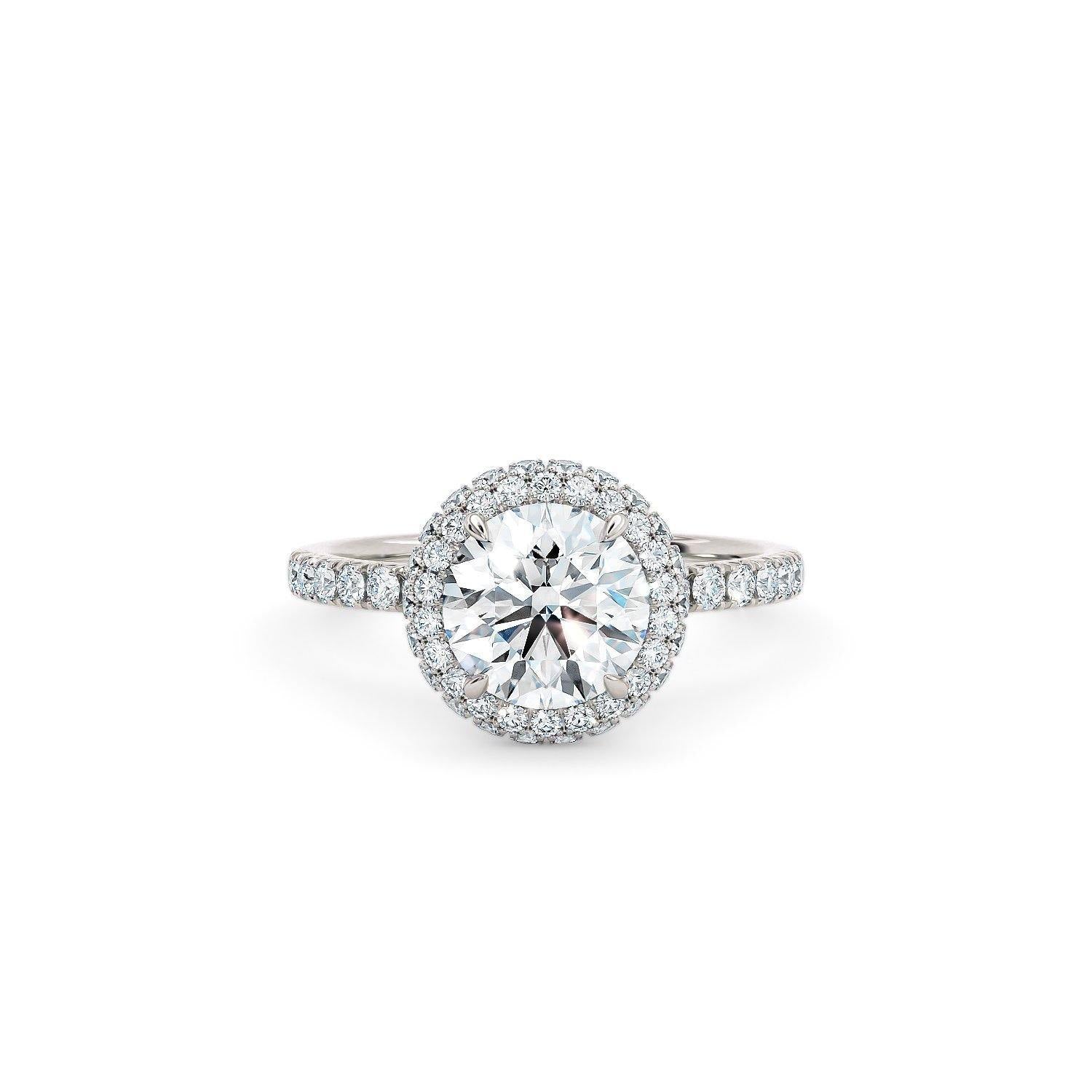 The round triple halo is crafted to enhance the look of the main diamond, using a perfectly balanced pave set halo and diamond band. The main halo features an additional halo around the bezel to ensure a more striking appearance. If you take a closer look, slightly on top of the...